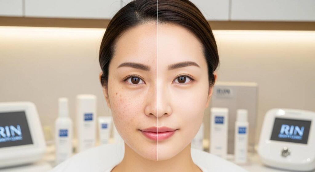 治療オプションとしては、レーザー治療、光治療(IPL)、ケミカルピーリング、美白注射などが挙げられます。特にRIN BEAUTY CLINICで人気の「ピコレーザー」は、従来のレーザーよりも短いパルス幅で色素を粉砕するため、ダウンタイムが少なく効果的にしみを薄くできます。また、トラネキサム酸やビタミンC誘導体を用いた美白治療も高い効果を発揮しています。
